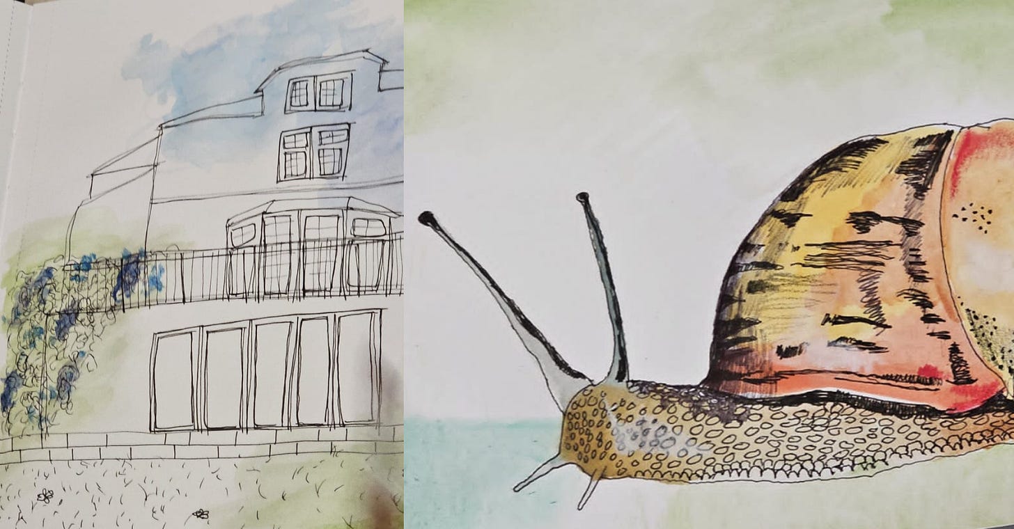 1) tuition on wonky pen illustration and wash (watercolour) using photos and objects as reference.